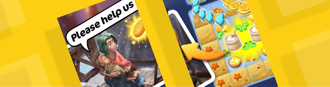 For example, in Gossip Harbor: Merge & Story's campaigns, one ad opens with a mother and daughter shivering in a cold, damaged room, immediately setting emotional tension. The scene then presents multiple repair options, followed by the merge grid with a guiding finger showing a few quick actions. Just as the situation improves, an unexpected setback interrupts the resolution, ending the video with unfinished tension that motivates viewers to download the app and continue the story themselves.